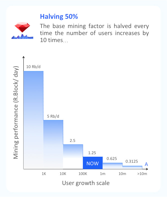 Due to the nature of commodity and born by mining based on user behavior, the number of assets put into circulation depends on the number of miners participating in mining. To limit the oversupply, Rubi adopts a rule that reduces performance as the number of miners increases. In fact, this theory is similar to resource mining in nature, if many miners are mining the same resource, competition will arise and the efficiency obtained for each individual will decrease.