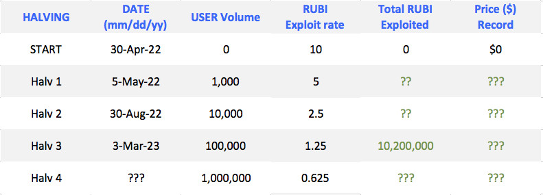 Since its launch, Rubi has gone through 3 Halvings (see table below)