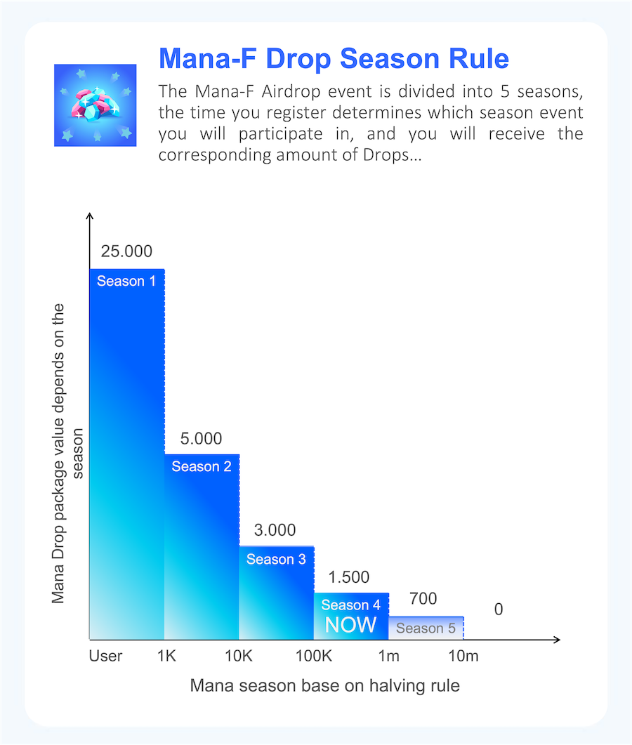 The Mana-F Drop event closely follows the halving roadmap so it will end when the total number of users reaches 10 million. Accordingly, the Halving event will go through 5 Airdrop seasons until the network reaches 10 million members. Below is the Mana release plan for each season: