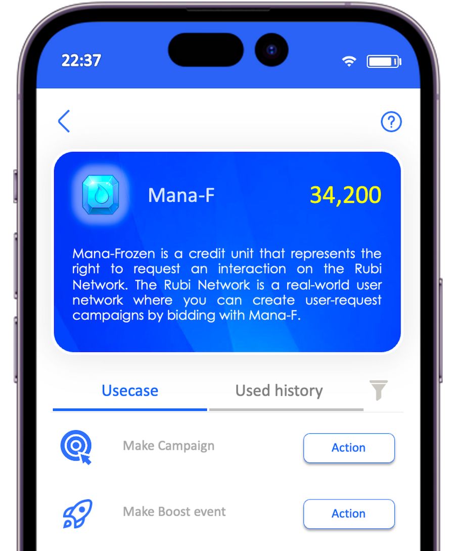 Mana-F is an application-token on the RUBI network, it represents a “request execution credit index” that you can use it to deploy a request interactive action of other users on the Rubi community network. So Mana-F is the token that represents your right to use Rubi network resources.